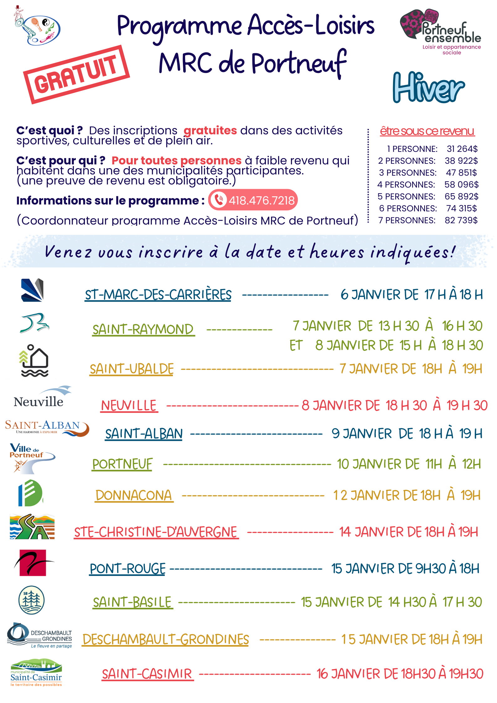 Voici les informations pour la période d’inscription pour les citoyens de PONT-ROUGE uniquement :